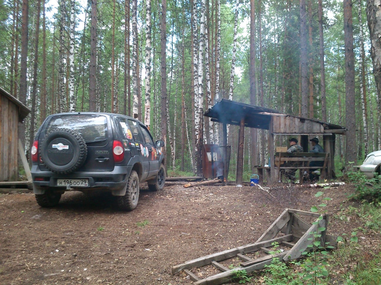 Выехали из города около 8 вечера, прикупившись в "Петромосте", затем догнали Женю в начале грейдера в районе "Бутырок", к полуночи добрались до Пинеги. Забрали лодку, "запомнили" координаты изб и двинулись дальше. Не с первого раза нашли правильный заезд, немного поплутали в темнеющем лесу, но к часу ночи добрались до крайней избушки между Карас и Чакольским. Изба оказалась занята, но ненадолго. Спустили лодку, пошли от избушку направо. У Жени пошли окушки с ладошку, у брата тоже, у меня - 0. Половили немного, вернулись, перекусили и снова ловить. Пошли налево вдоль берега - попалась щучка, опять немного окушков. Вернулись обратно к 7 часам, захотелось спать. Проснулись около 13, сварили поесть и снова на озеро. На блесну долго не клевало, достал поплавочку, на неё пошли небольшие окушки. Перебрались к "своему" берегу, снова стали бросаться на блесну. Попалась и щучка. Решили вечером перебраться на реку. Собрались, добрались до Пинеги, потом налево в сторону Кулогор. Спустились на берег, поставили палатку, сварили суп. Побродили по берегу. У меня опять только один окушок на удочку и 2 моллюска. Переночевали, позавтракали, в 9 утра стали собираться в сторону дома. Завезли Дмитрию прицеп, стравили у меня колеса до 1,7. Женя остался в поселке. Заправился и порулил домой.