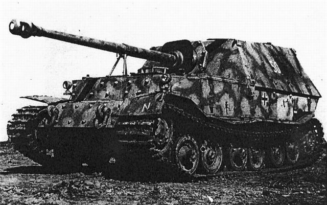ага,точно- разработка того самого Фердинада Порше - САУ "Элефант" с 88мм орудием ,наши бойцы его "Фердинадом" и называли (да и все остальные немецкие самоходки до кучи тоже "фердинандами" называли ). Выпущено всего 90 штук. Организационно сведены были в два тяжелых батальона -653 й и 654 й - в каждом по 45 машин. В июле 43 - го получили сокрушительных п.....лей под Курском, вроде бы на северном "фасе" Дуги. Остатки батальонов -всего что то около 19 -22 машин с трудом эвакуированы, и вновь вступили в бой только в Венгрии, у озера Балатон - где впрочем снова получили звиздулей.Но наших танков они сожгли-это страшно представить ....