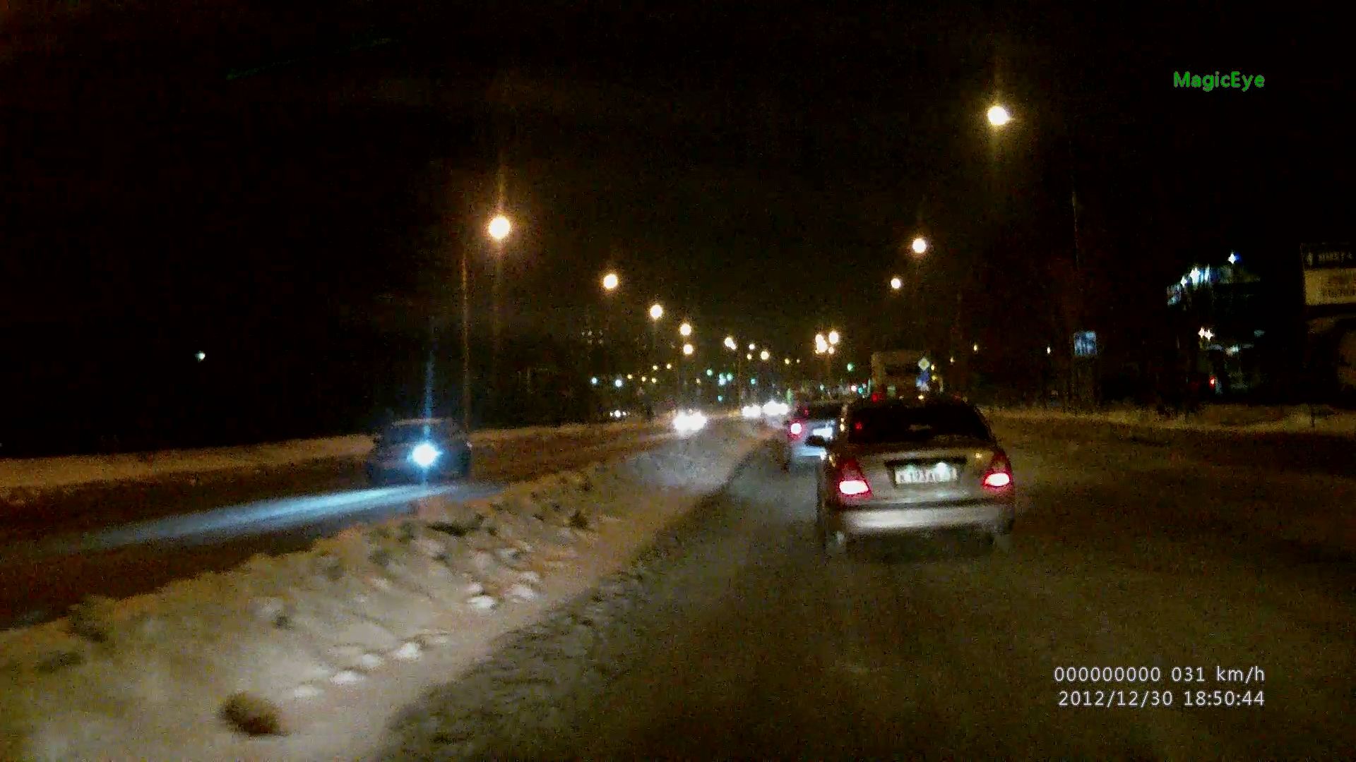 Выкладываю несколько фотографий: ночная и дневная съемка видеорегистратором MagicEye HD70G. Одна из фото - окно плеера (записан в самом регистраторе), где проигрывается один из файлов.