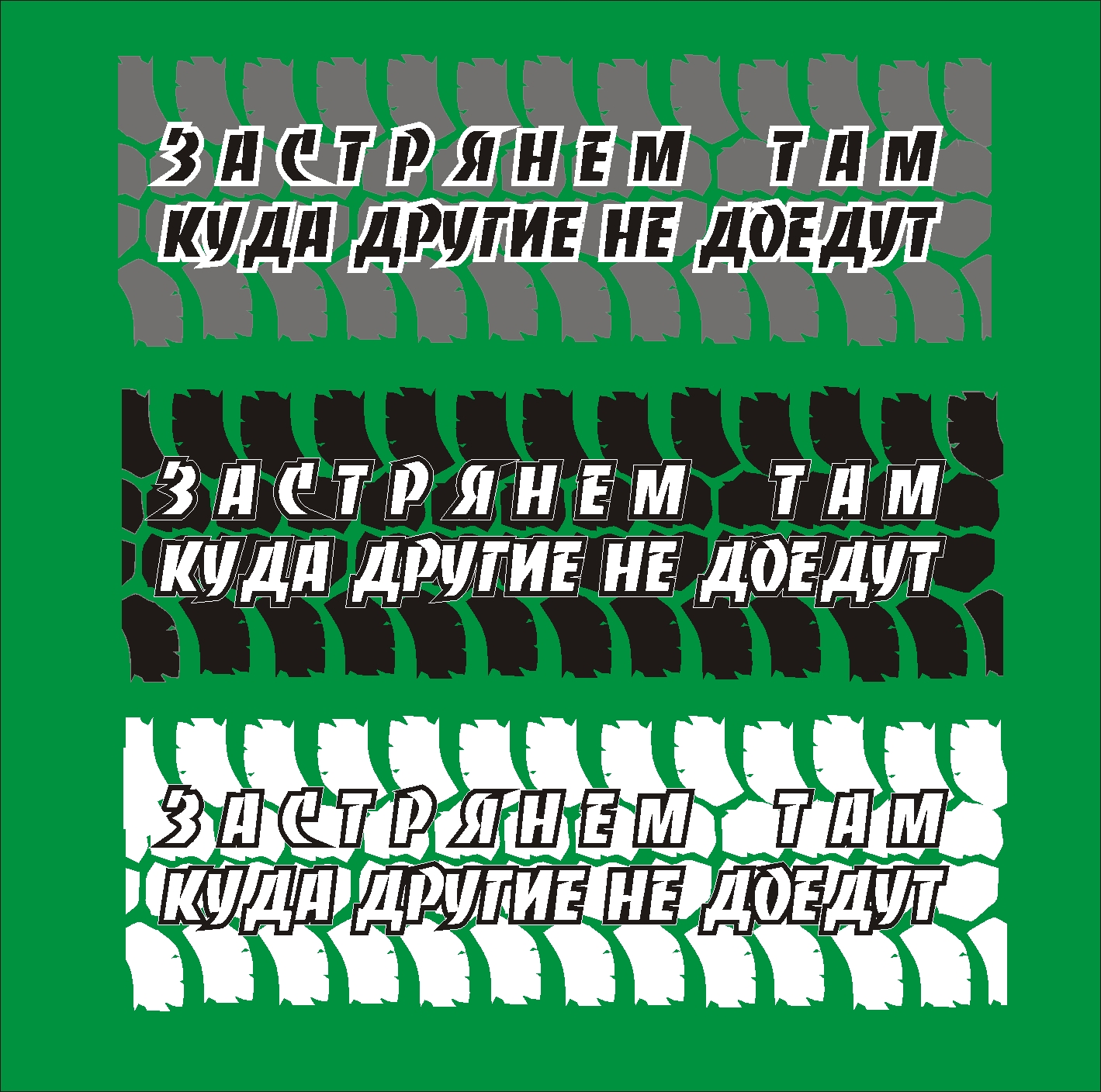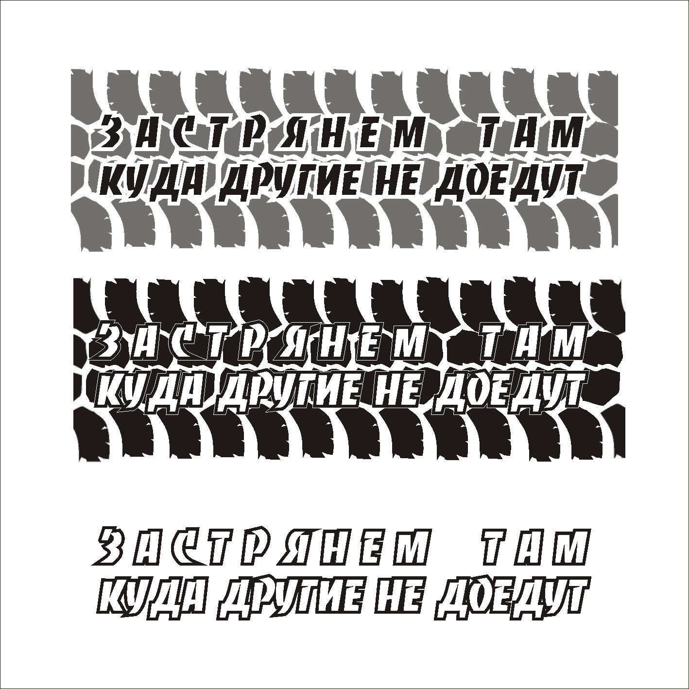 Либо оставляем один слоган и ссылку на сайт, либо слоган и протектор, но в стиле Mikh72. Ибо использовать след зимней резины и бездорожный слоган просто смешно. Далее, слоган точно решили "Застрянем там..."? Просто мы неоднократно наблюдали ситуацию, когда другие и доедут и дальше поедут, бывало и наоборот, но факт есть факт. Больно уж пафосно получается. Вариант "Мы не ищем лёгких путей. Нам лень" кажется мне абсолютно нейтральным и никому не обидным. Ну а на нелёгком пути и застрять не грех