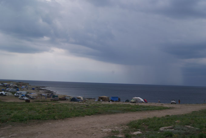 Да, кстати, для любителей более цивильного отдыха чем палатка, там же на побережье можно снять трейлер для проживания. Стоимость кажется от 100 гривен в сутки (в переводе на рубли-400р) в зависимости от размеров и удобств. Как оказалось до 15 июля погода на Тарханкуте неустойчивая (это подтвердили старожилы). На третий день поднялся ветер, началась гроза… весело было . Мимо пролетела 2-х местная палатка)) Зрелище то ещё. Под проливным дождём собирались домой, все вещи сохли потом ещё два дня. Зато впечатлений сколько!!!! |